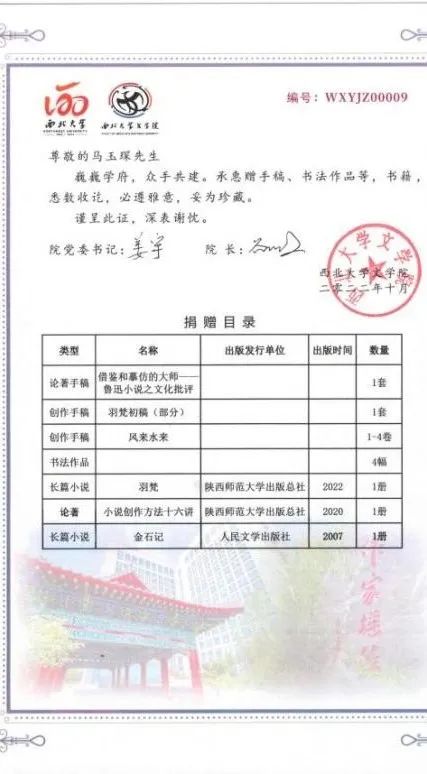 在采访结束前,马玉琛惠赠部分作品手稿和书法作品四幅,以资院友馆建设和收藏用。最后,他向母校和后辈学子送上了衷心祝福:“时值母校西北大学120华诞的喜庆时刻,我送上最衷心的祝福。祝母校西北大学薪火相传,人才辈出,各项事业兴旺发达。也祝愿我们的学子,为母校再创佳绩,增添新的光彩。”